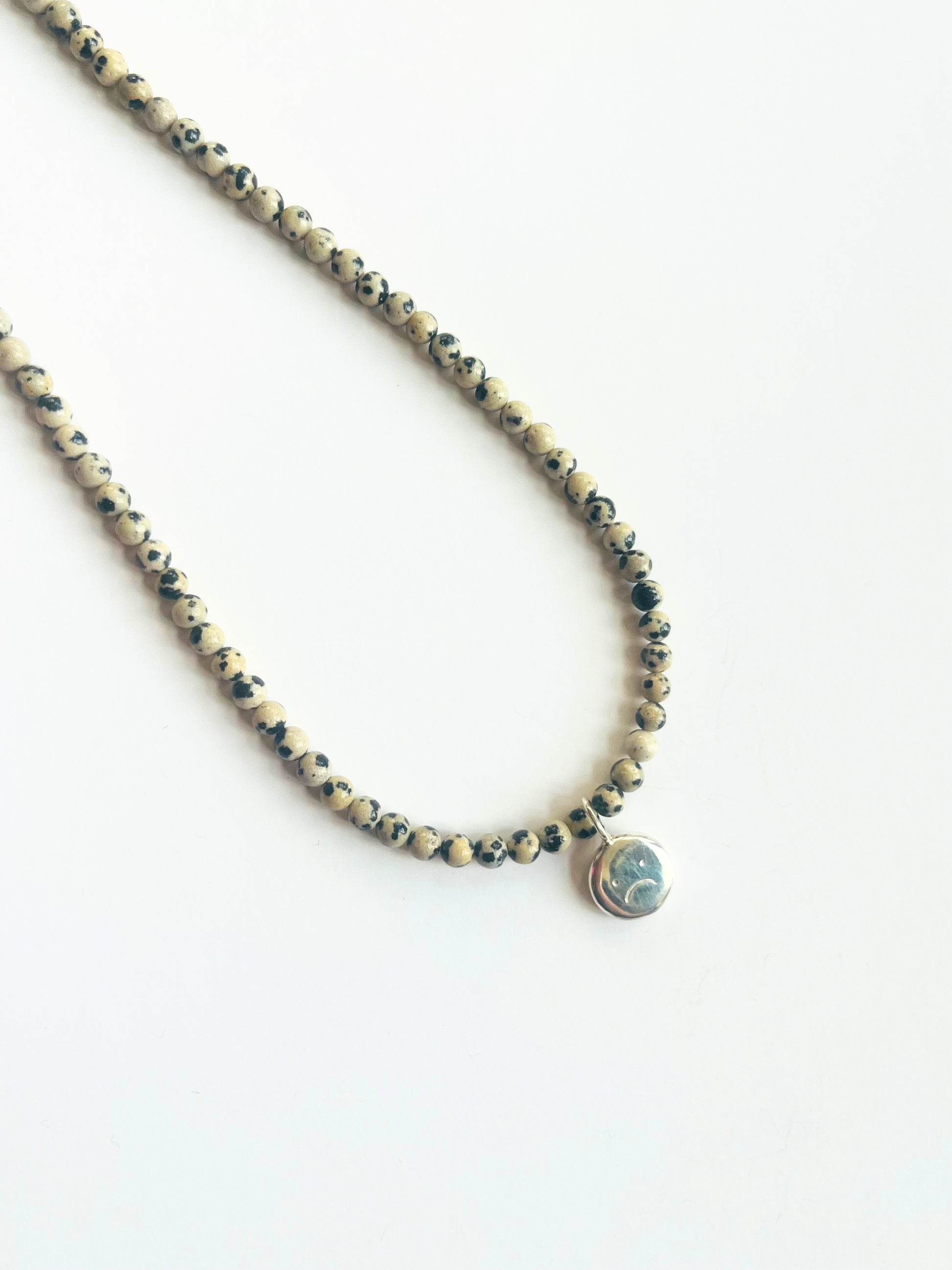 This Dalmatian Jasper beaded necklace holds a silver two-sided smiley pendant - happy on one side, sad on the other - as a daily reminder of the little things or people (or dogs) that can turn your mood around.