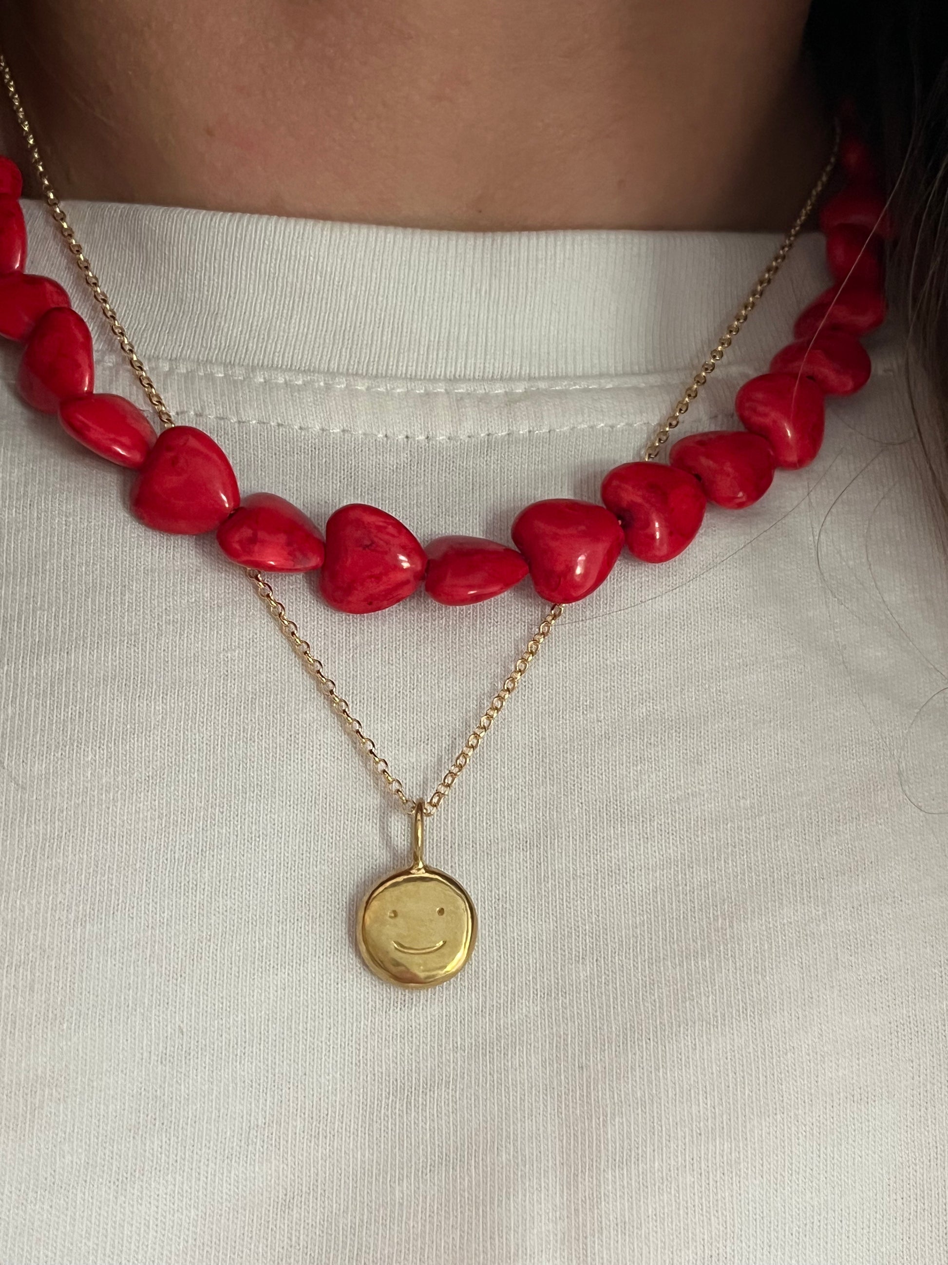These heart shaped beads add a pop of colour to your neck stack, whether worn alone or layered up with your smiley necklace.